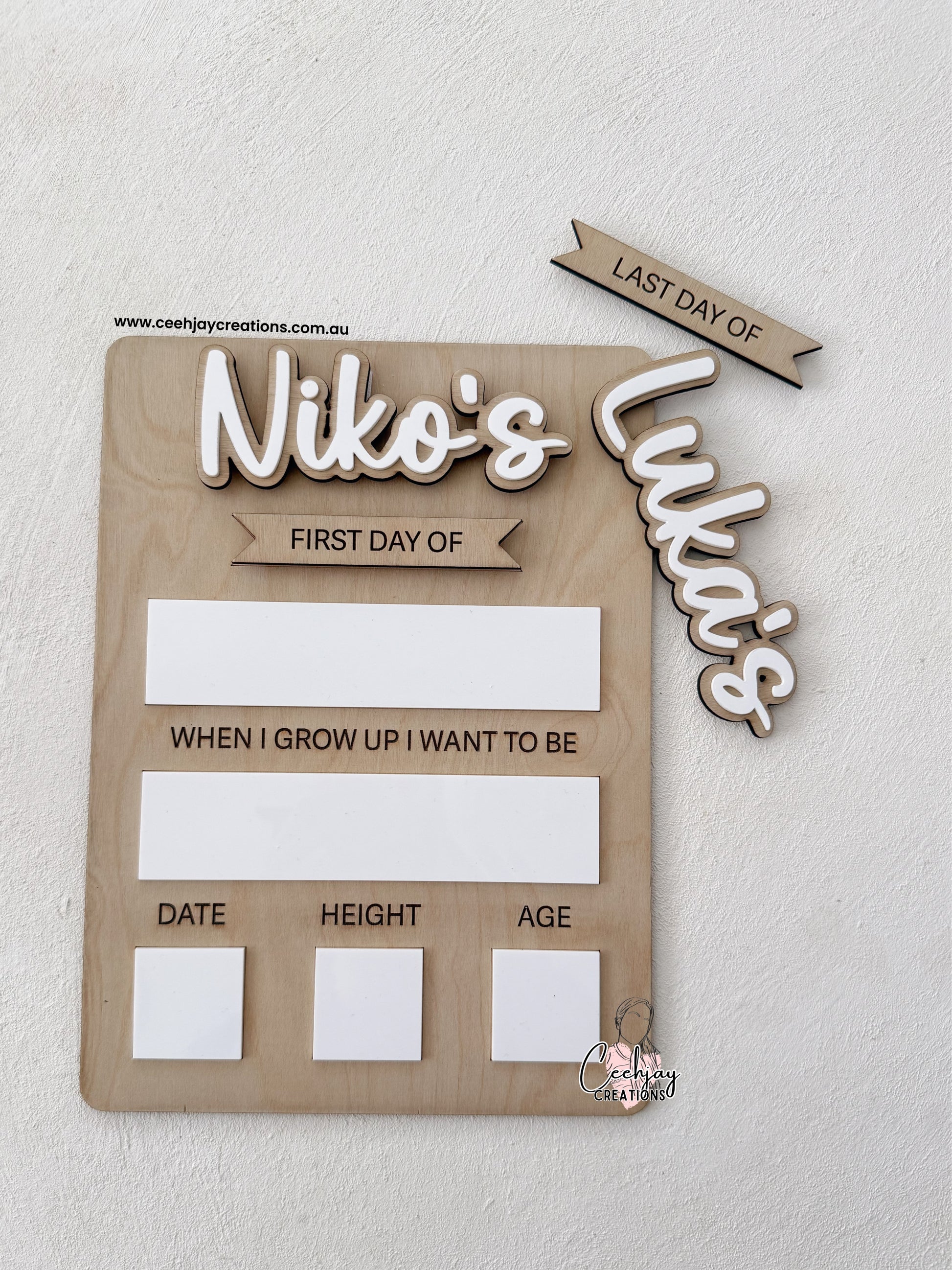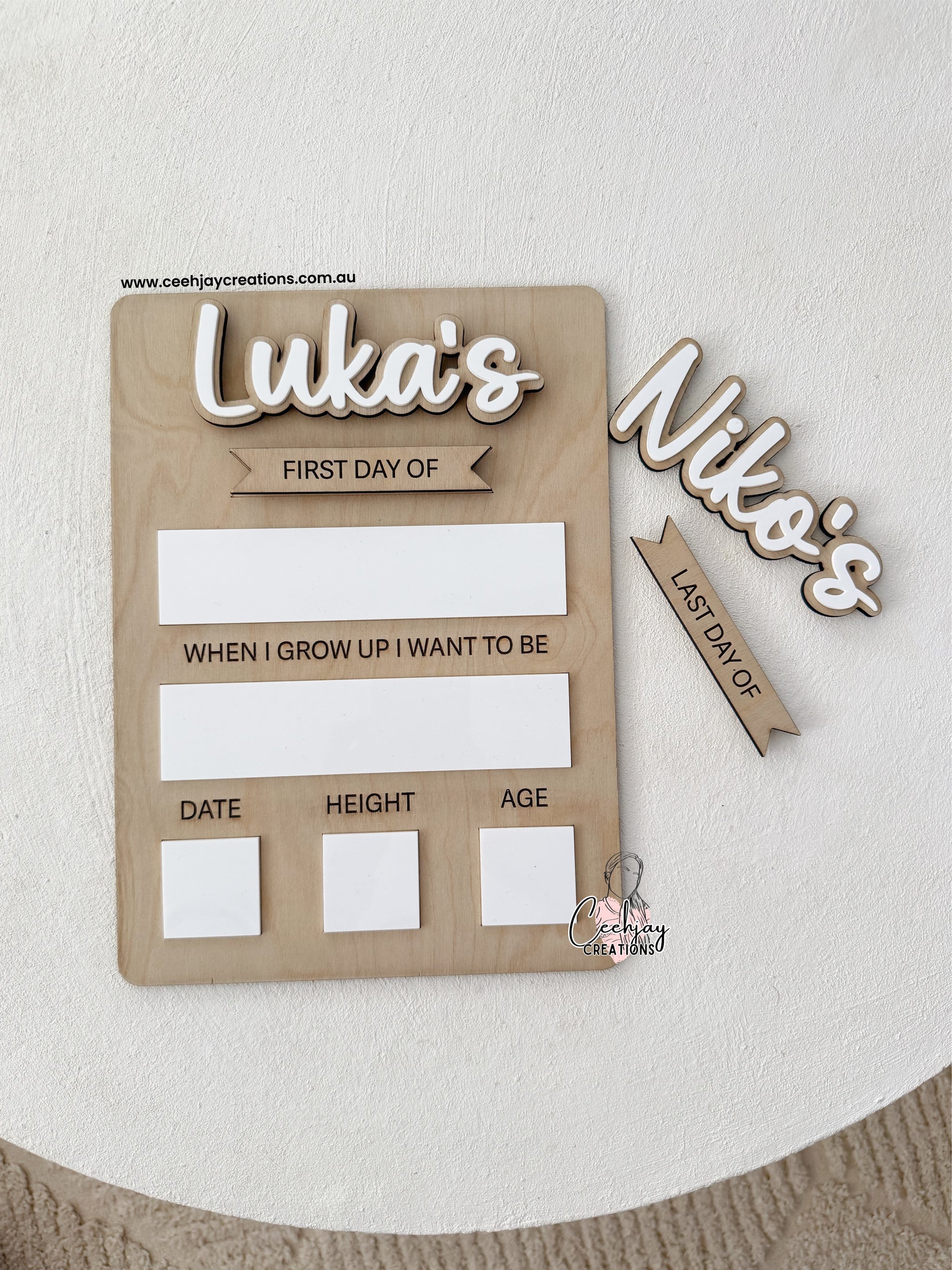 Introducing our First Day of board. This board is perfect for your kids first day and last day of school, childcare, dance, swimming school etc. Durable and versatile, it's the ideal tool for young minds to learn and grow.