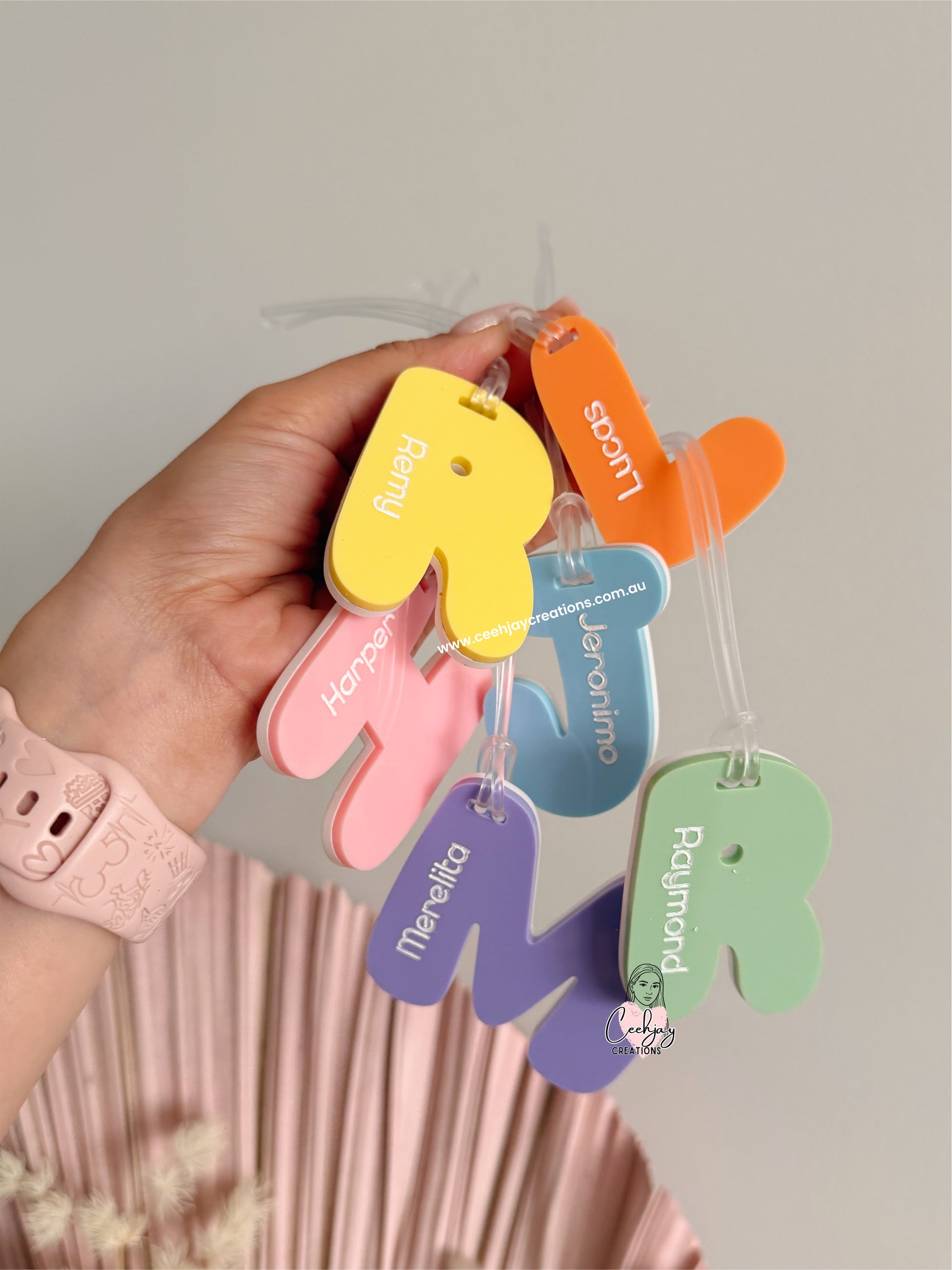Our initial bag tags are made in double layer acrylic for durability. White base and any first colour of your choice with engraved paint filled name added on top. It's durable, cute and makes it easier to you and the kids to spot their belongings.