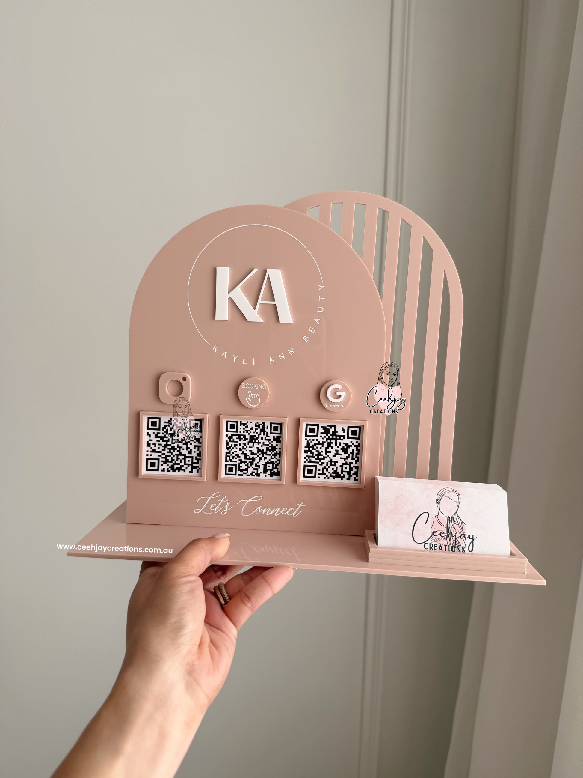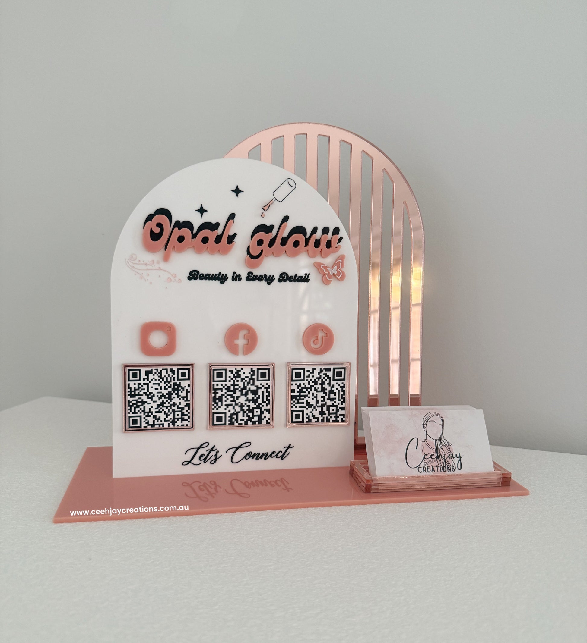Elevate your business and stand out from the crowd with our Acrylic Business Sign with business card holder and 3x QR codes. The perfect way to display your business cards with QR codes to guide your customers to your website, socials, to book an appointment or to make payments. The options are endless!