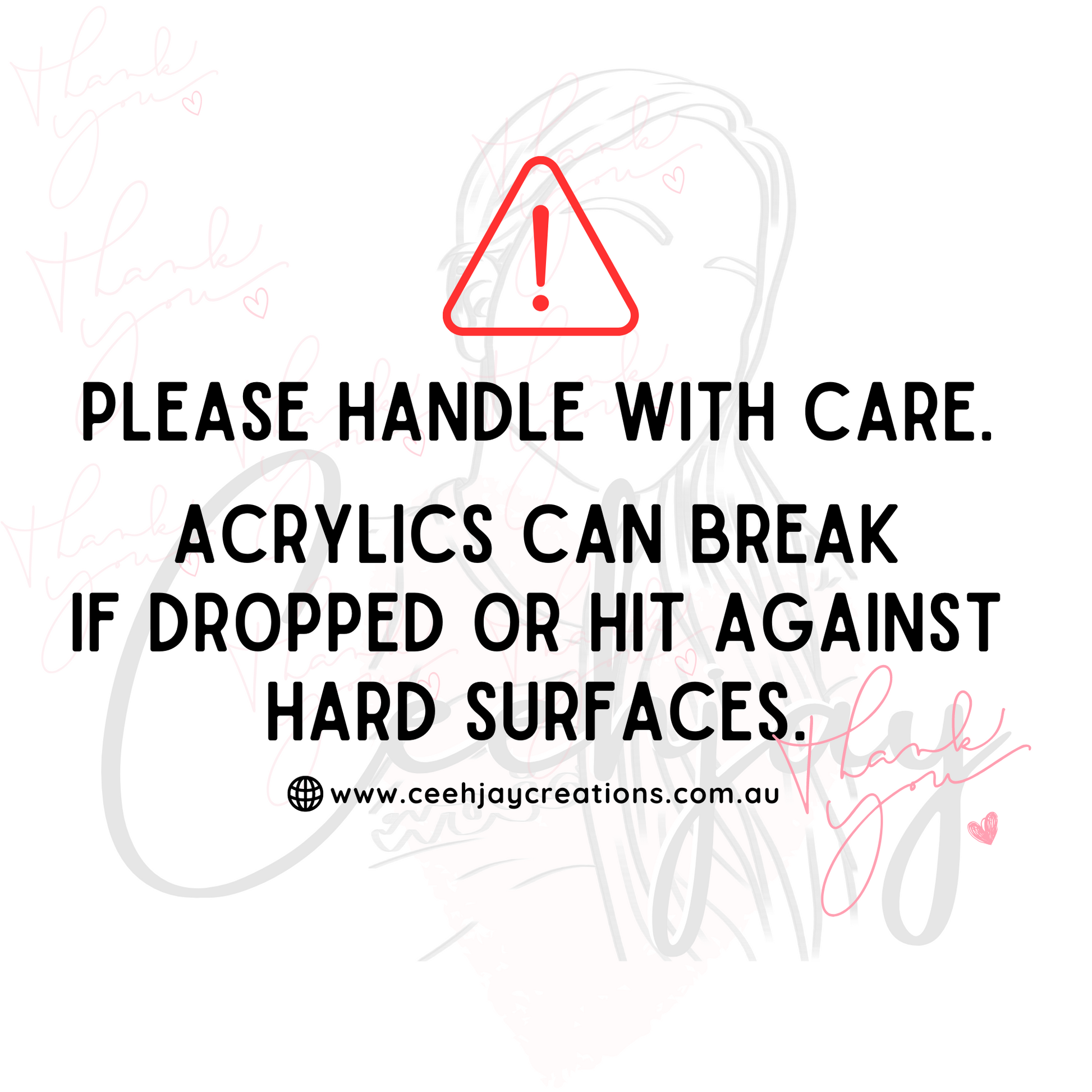 NOTE: These are made with acrylic (hard plastic) but they can break if dropped or hit against hard surfaces. Please handle with care as we are not responsible for broken items.